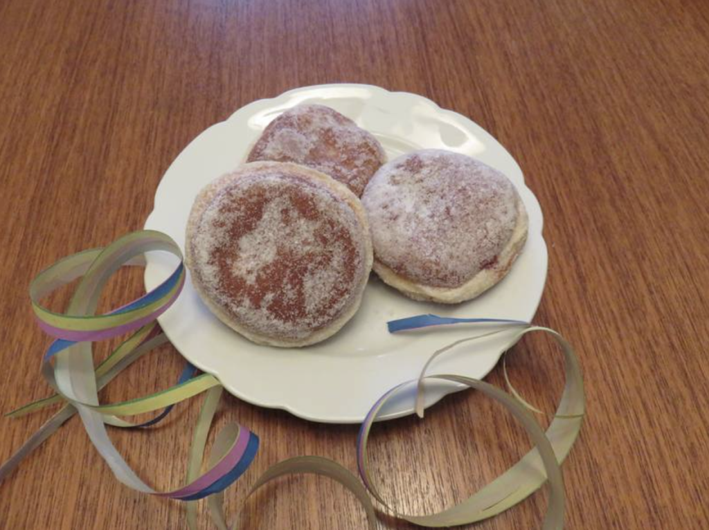 After we ate dinner (with gummy pizza for dessert, which isn’t a tradition, it’s just fun) we had Krapfen, a kind of jelly donut. The donut was first made in Germany over 200 years ago and then brought over to America much later. In America, they changed them to have a hole in the middle. It’s a tradition in Germany to eat Krapfen on New Year’s Eve. There are so many bakeries in Hannover where we’re staying right now, and they were all full of Krapfen! It looked like each bakery had hundreds of them and by the end of the day they were all gone.