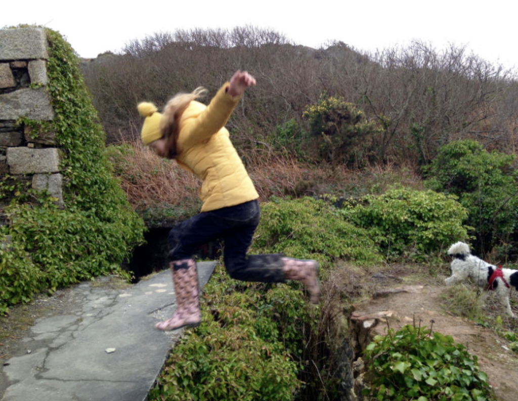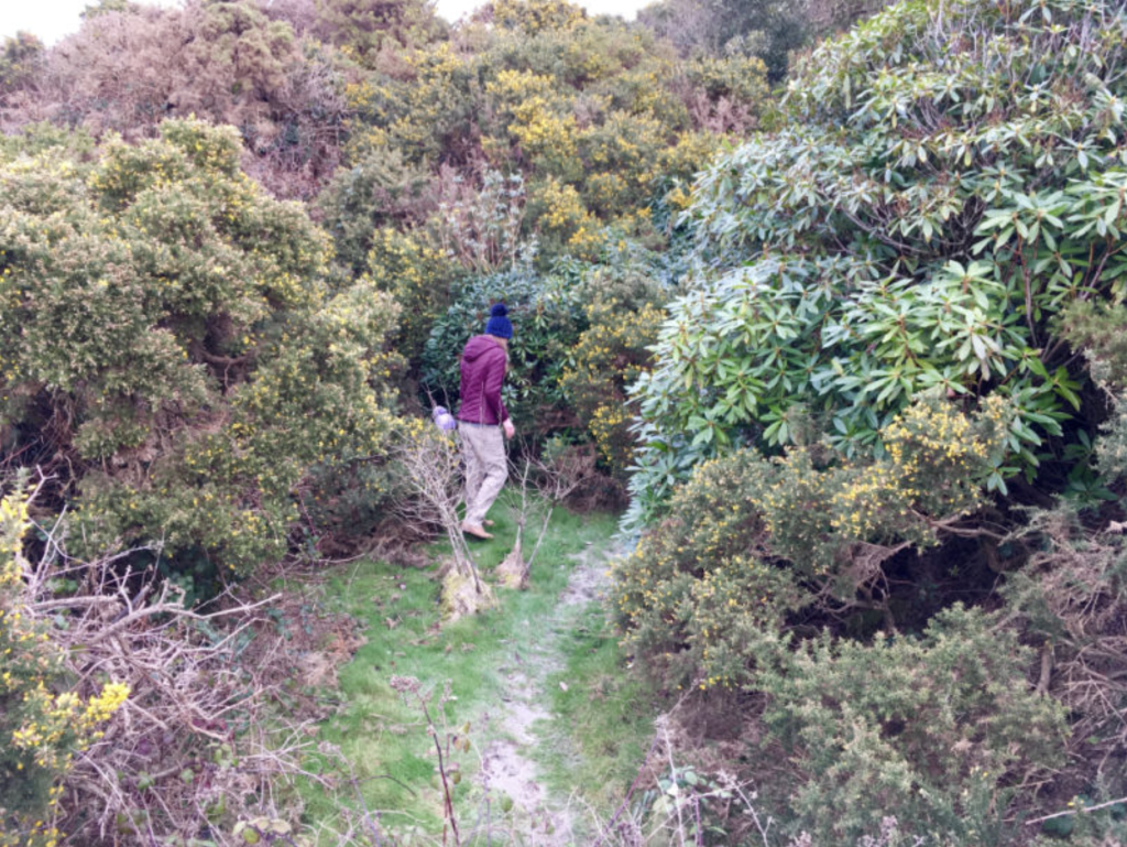 After a while we noticed yet another smaller path leading off to one side, this one even narrower and through thicker brush than the first. Again, we couldn’t see where it led because it was surrounded by tall grass. When we got to the end we found ourselves standing in front of a sort of crevasse about ten feet deep. It was only about three feet across though, so we jumped.